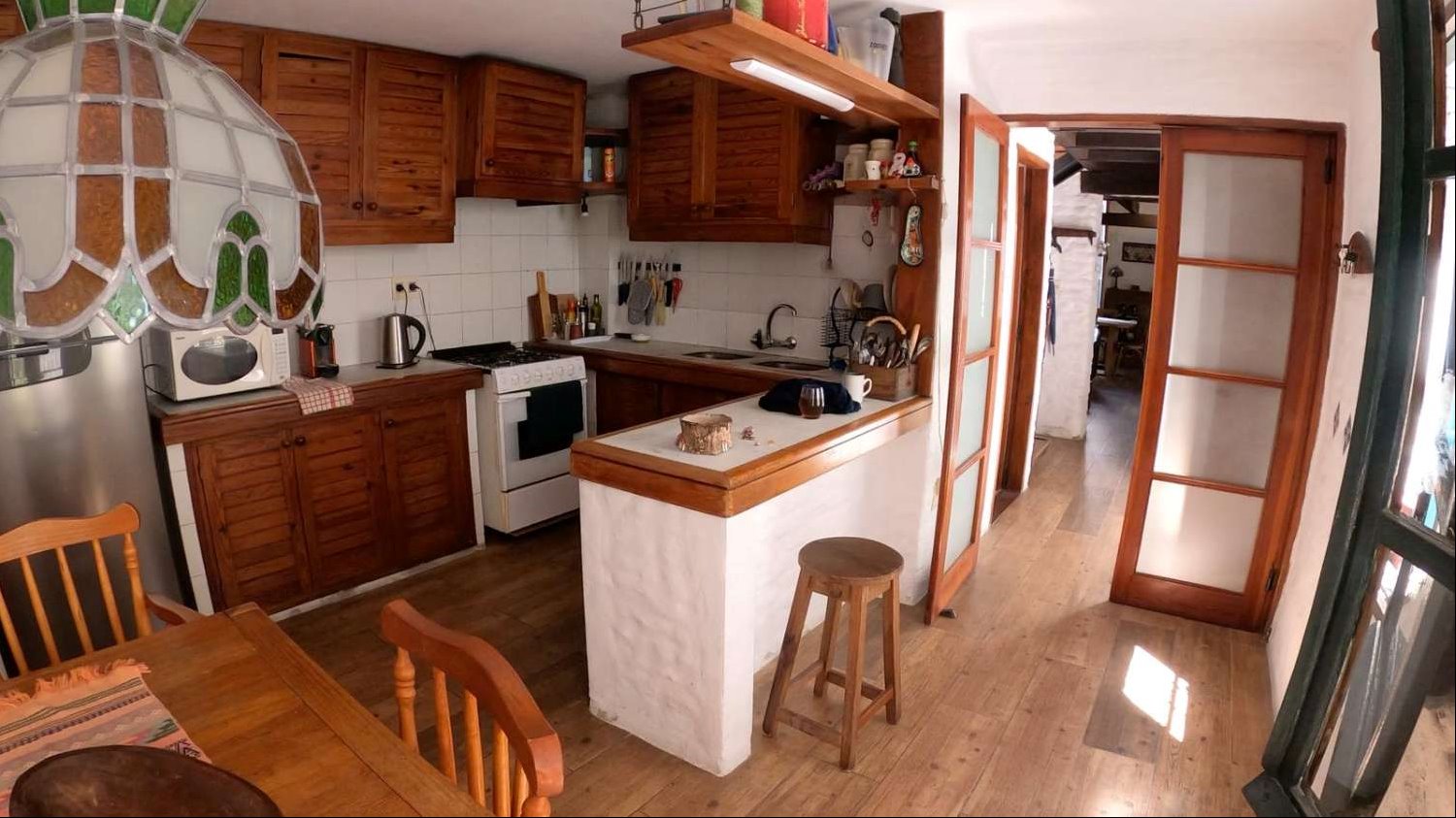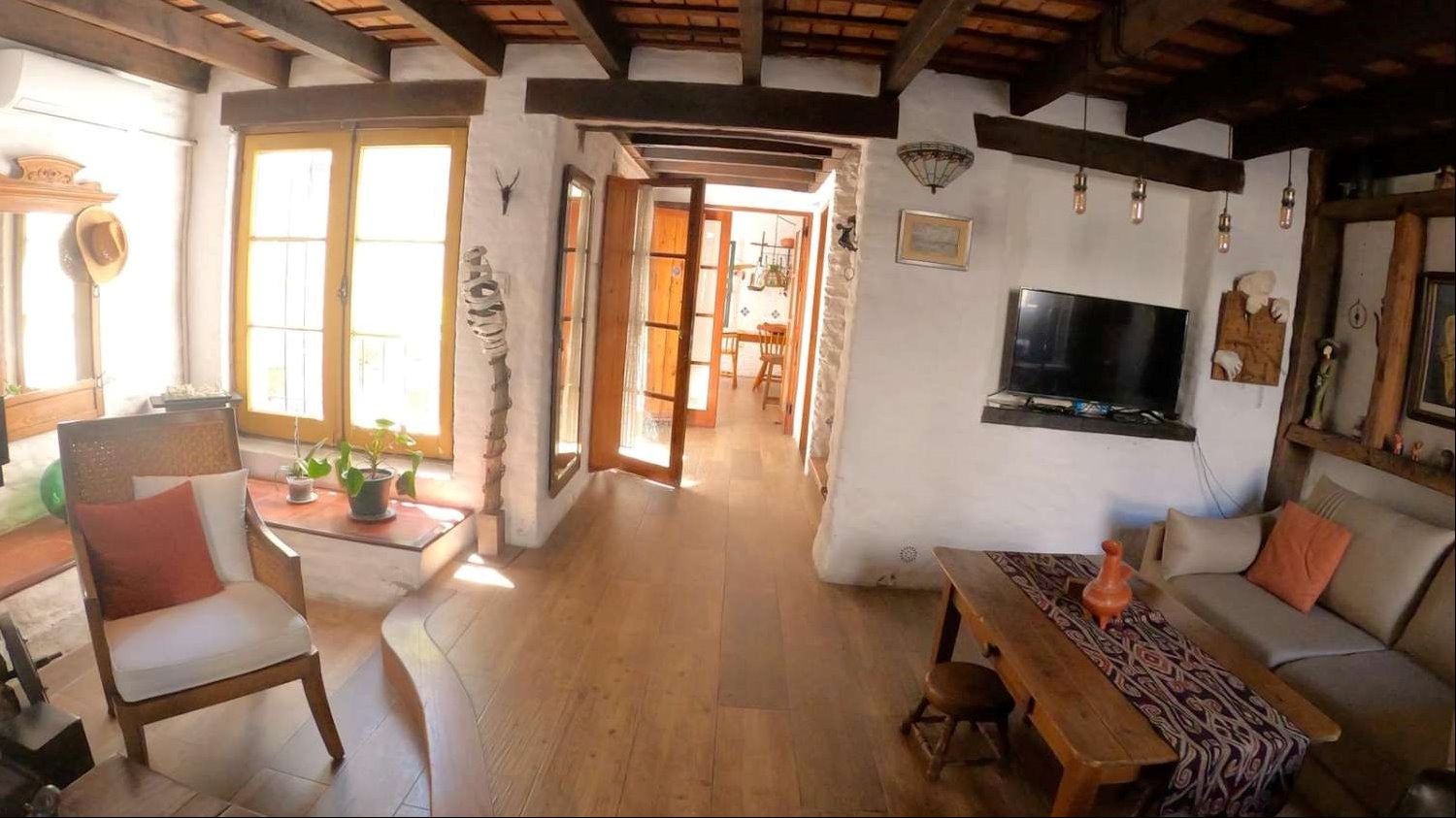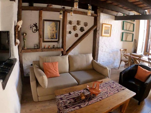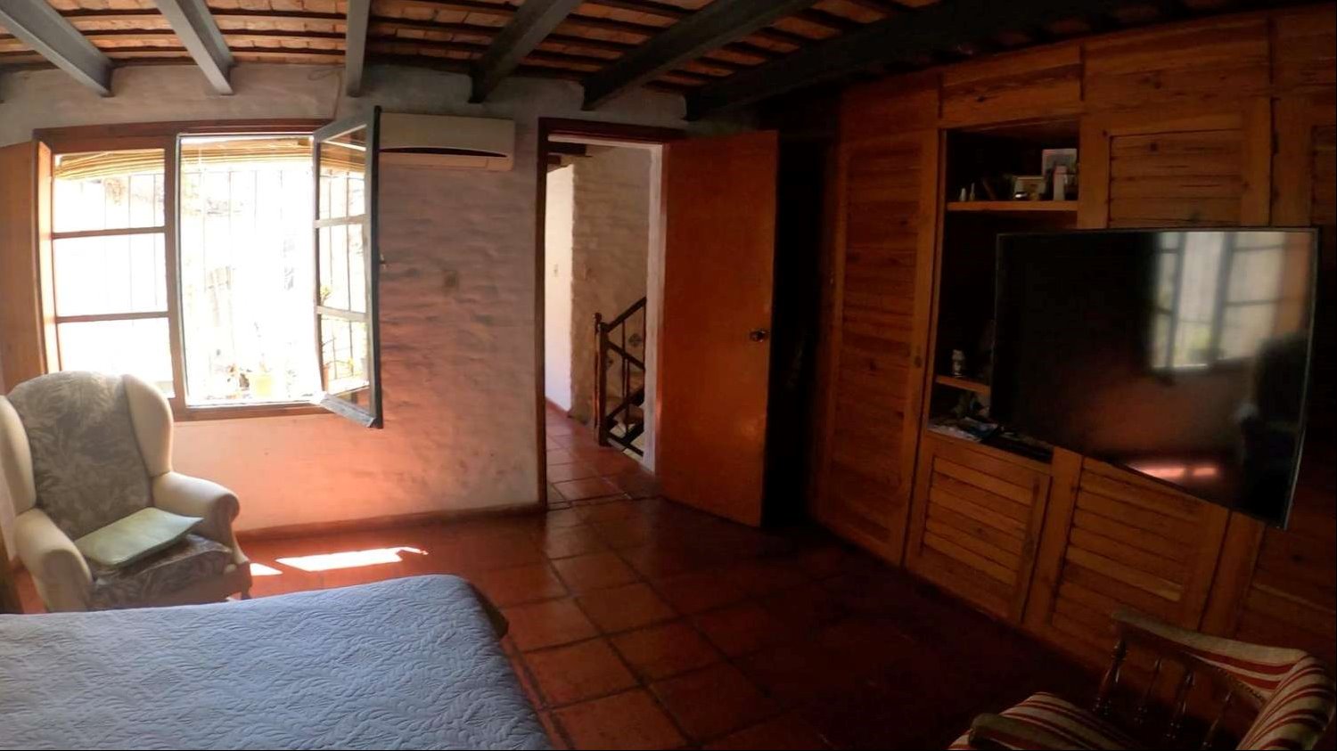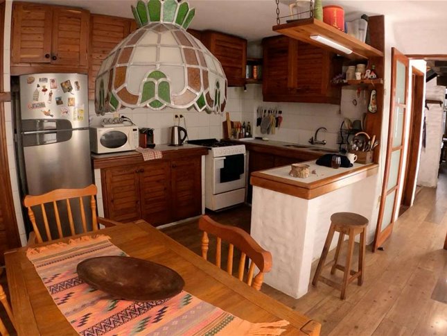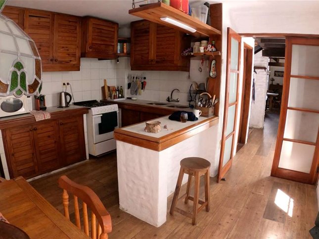 La distribución interior incluye una cocina definida, un espacioso estar con una increíble estufa a leña, un escritorio ideal para trabajar desde casa o para estudio, y un lavadero independiente. Los dormitorios disponen de placares empotrados, optimizando el espacio de almacenamiento. La calefacción principal es a través de una estufa a leña, aportando un ambiente cálido y acogedor, además cuenta con tres equipos de aire acondicionado. La orientación sur garantiza buena luminosidad natural durante gran parte del día.